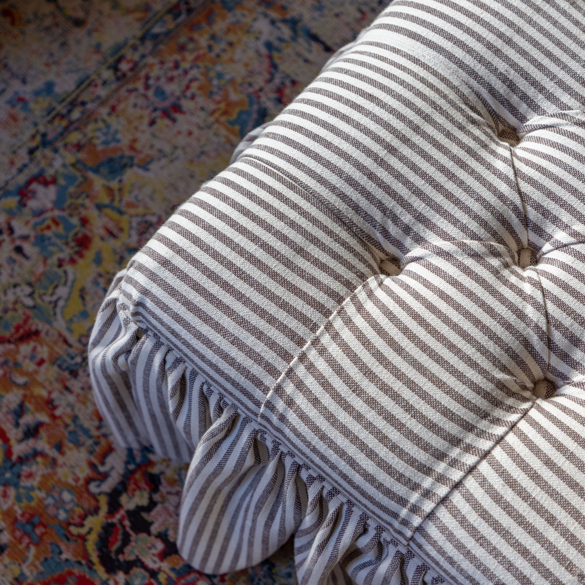 Its clean, tailored form is softened by plush upholstery, allowing the fabric to take centre stage. Shown here in Tinsmith Uno Stripe in Bark Brown, the Felcome highlights how pattern and texture can transform a simple silhouette into a statement piece.