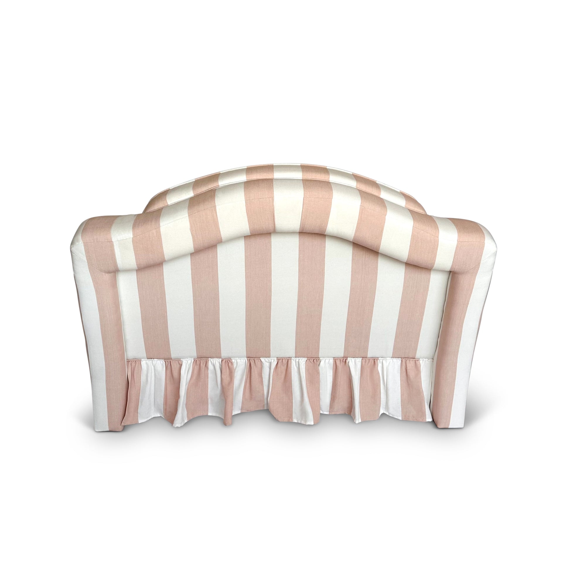 This fully upholstered armchair features structured side supports for added comfort, and a beautifully pleated skirt that softens its bold proportions with a touch of romantic charm. As seen here in a striking striped fabric by ROMO, the Soma is equally impactful in solid tones or playful patterns, making it ideal for a variety of interior styles—from classic to contemporary.